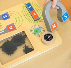 Ova robusna drvena ploča potiče znatiželju i razumijevanje osnova fizike. Djeca mogu eksperimentirati s privlačnošću i odbojnošću magneta, promatrati silnice u opiljcima željeza i istraživati strane svijeta pomoću kompasa. Sve je jasno prikazano i sigurno ugrađeno u panel, pa je učenje pregledno i zabavno.