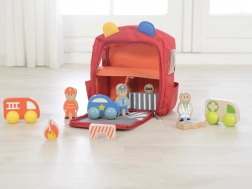 Nakon rasklapanja nastaje kompletna scena spasilačkih službi – policija, vatrogasci i zdravstveni djelatnici. U kompletu su drvene figurice, vozila i dodaci koji pozivaju na otvorenu igru i igru uloga. Po završetku igre sve se lako vraća na svoje mjesto, a ruksak se zatvara patentnim zatvaračem.