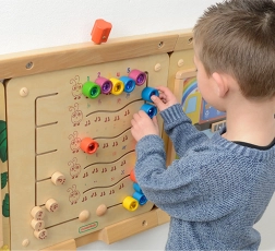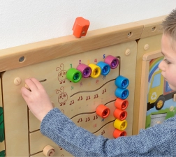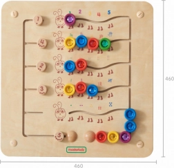 S lijeve strane nalaze se pomični prekidači za zadavanje zadataka – djeca tako mogu vježbati brojanje naprijed i natrag do 5, pridruživati količine i boje te uvježbavati logičko razmišljanje. Osim razvoja fine motorike i koordinacije oko–ruka, igračka pomaže i u koncentraciji te vizualnoj percepciji.