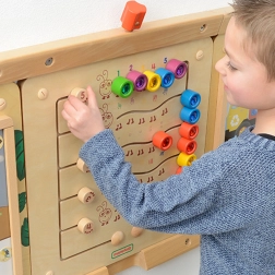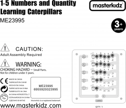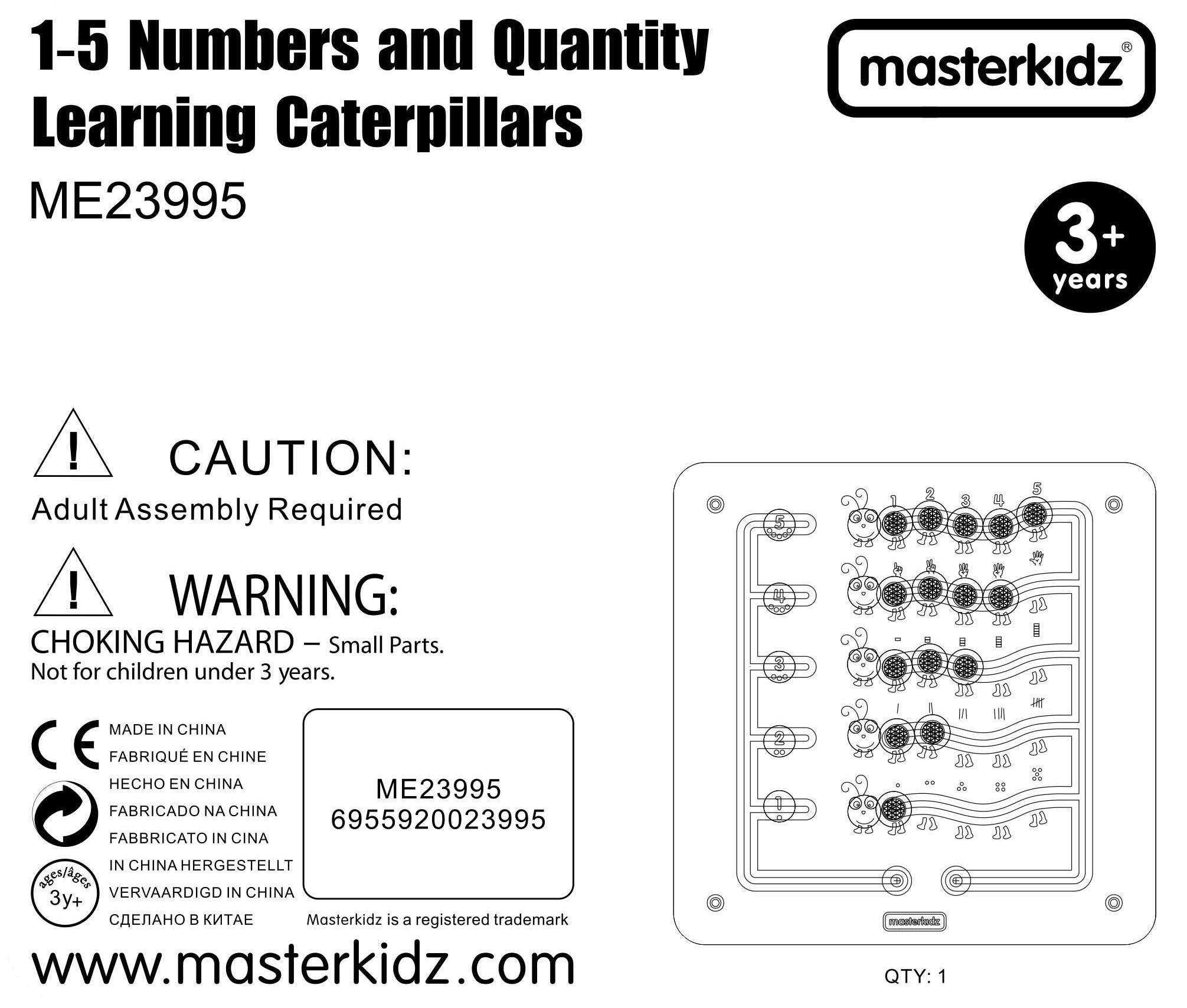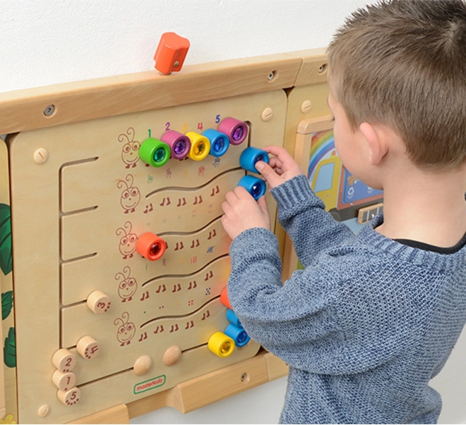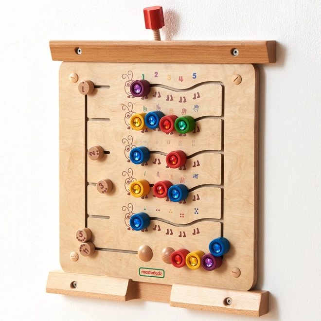 Ova robusna drvena zidna ploča MASTERKIDZ prikazuje pet šarenih gusjenica i 15 pomičnih “dragulja” u pet boja. Djeca ih mogu pomicati po vijugavim stazama, ali ih nije moguće izvaditi, što osigurava sigurnu i dugotrajnu igru u domu i vrtiću. Ploča prikazuje pet načina predstavljanja brojeva 1–5: brojke, prsti, crte, blokovi i točkice.