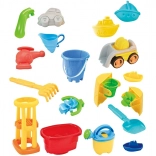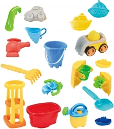 Kalupe, kanticu, lopaticu, grabljice, autić i dva čamčića potiču kreativno građenje, pretakanje i zajedničku igru više djece.