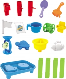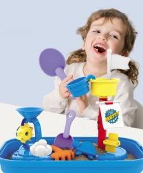 Sadrži sve potrebne alate za kreativnu igru s pijeskom i vodom - kalupiće, grabljice, lopaticu i još mnogo toga.