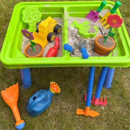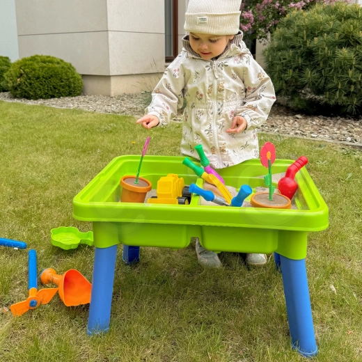 Bogata oprema od 13 dodataka (kanta za zalijevanje, lopatice, grabljice, kalupi, mali autić–kiperi, teglica s cvijetom i drugo) potiče maštu, razvija finu motoriku te podržava samostalnu i zajedničku igru. Idealno za vrt, terasu, plažu i dječju sobu.