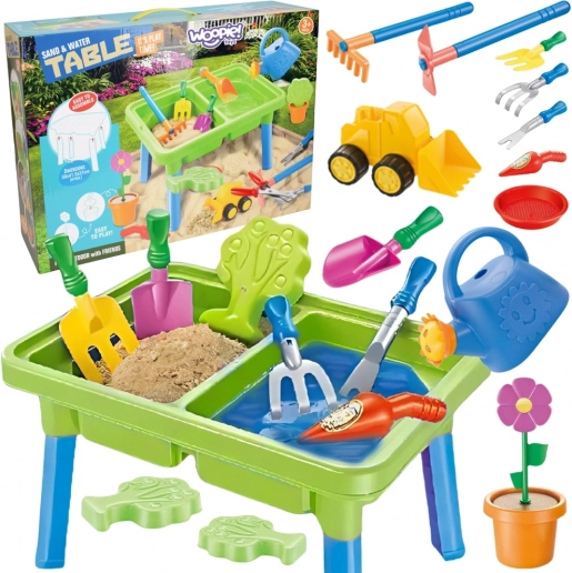 Dječji 2-u-1 igraći stolić marke WOOPIE kombinira vodenu i pješčanu zabavu u jednom. Ima dva spremnika za vodu i pijesak, sadrži 13 šarenih dodataka te potiče kreativnu i osjetilnu igru na otvorenom i u domu. Laka konstrukcija, jednostavno sastavljanje i sati zabave za djecu od 3 godine naviše.