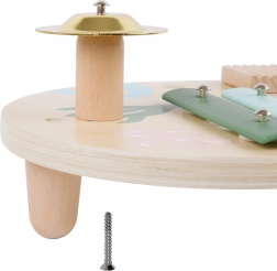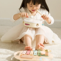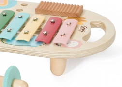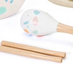 Ovaj set sadrži pet različitih glazbenih instrumenata koji savršeno pristaju u male dječje ruke. Svaki instrument izrađen je od kvalitetnog drva i obojen netoksičnim bojama, koje su sigurne za djecu i okoliš.
