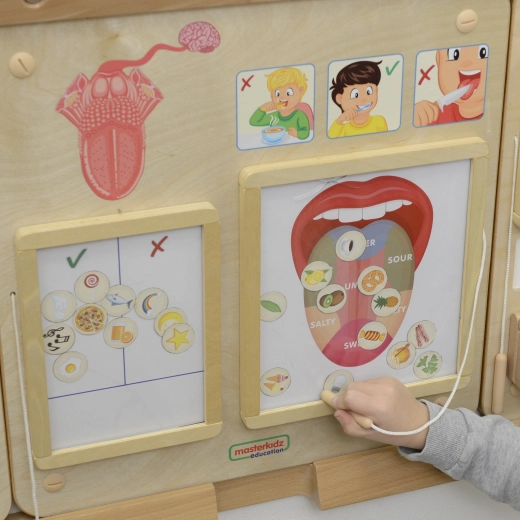 Edukativne ploče marke Masterkidz usmjerene su na spoj zabave i učenja. Ova je ploča osmišljena za širenje dječjih vidika u području okusa i osjetilne percepcije. Zabavni i interaktivni elementi omogućuju djeci kroz igru otkrivati kako naš jezik prepoznaje različite okuse.