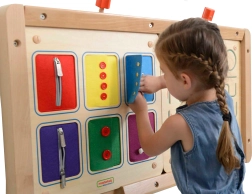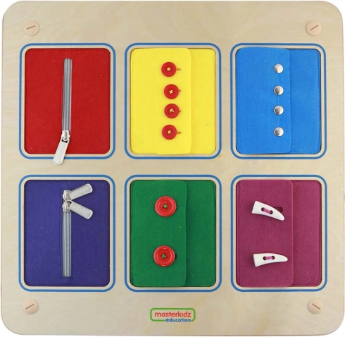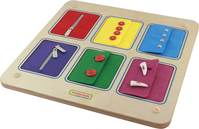 Šest tekstilnih panela vjerno oponaša zakopčavanje na jaknama i košuljama. Djeca mogu sigurno uvježbati patentne zatvarače, gumbe i drukere prije primjene u stvarnom životu.