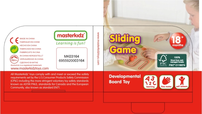 Ova Montessori-inspirirana klizna ploča MASTERKIDZ podržava prirodno učenje kroz igru. Djeca pomiču obojene klizače po četiri vrste staza, čime vježbaju pravilne pokrete zapešća i prstiju važne za buduće pisanje. Stabilan, fino brušen drveni materijal ugodan je na dodir i potiče istraživanje.
