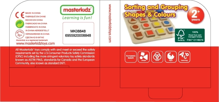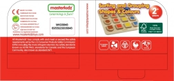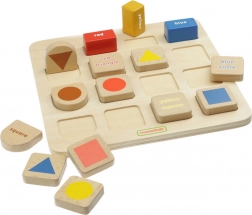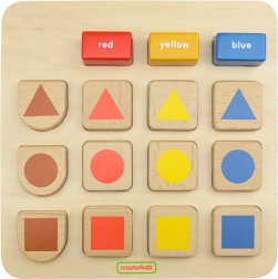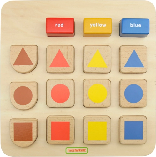 Ova kvalitetna drvena didaktička pomagala brenda MASTERKIDZ razvijaju prepoznavanje oblika (krug, kvadrat, trokut i dr.) i boja (crvena, žuta, plava). Djeca umeću dijelove na odgovarajuća mjesta prema boji ili obliku te se istovremeno upoznaju s engleskim nazivima otisnutima na blokovima.