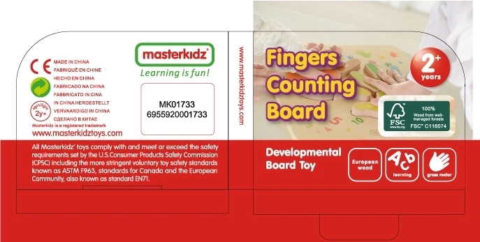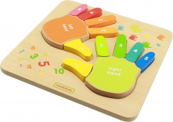 Drvena ploča za brojanje na prstima MASTERKIDZ idealno je pomagalo za predškolce i mlađe školarce. Obojeni dijelovi u obliku prstiju numerirani su i imenovani, kao i cijeli dlanovi – desni i lijevi. Djeca tako lako povezuju nazive prstiju s brojevima i mogu prenijeti stečene vještine na vlastite ruke.