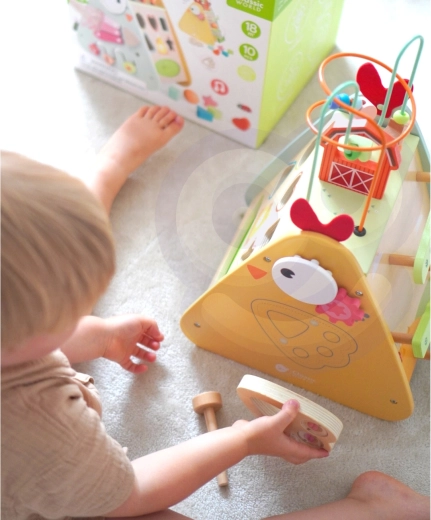Ova edukativna kocka s motivom vesele farme nudi čak 10 aktivnosti u jednoj igrački koje djecu prirodno vode prema otkrivanju, isprobavanju i učenju kroz igru. Zahvaljujući živim bojama i domišljenim mehaničkim elementima djeca uče prepoznavati oblike i boje, vježbaju strpljenje i jačaju logičko razmišljanje.
