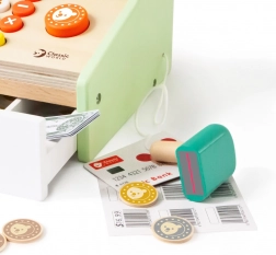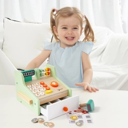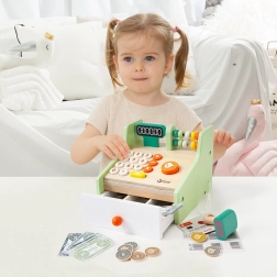 Ova drvena blagajna idealna je igračka za male prodavače i kupce. Nudi realistične elemente poput zaslona, tipki, brojača, izvlačne ladice i skenera, zahvaljujući kojima djeca usvajaju osnove računanja, vrijednost novca i uobičajene situacije iz svakodnevnog života.