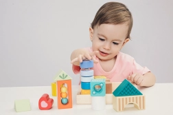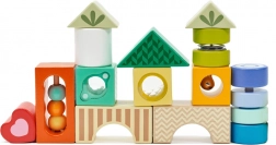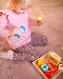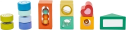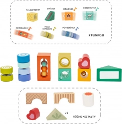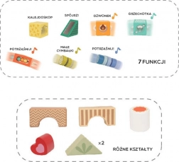 Ovaj kvalitetan set sadrži raznolike oblike i elemente za osjetilnu stimulaciju – prozirne dijelove, zvučne i pomične detalje – koji djecu prirodno vode prema promatranju, sortiranju i otkrivanju. Igra s kockama razvija logičko razmišljanje, rješavanje problema i koordinaciju oko–ruka.