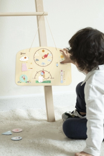Ova pametna i zabavna ploča pomaže djeci razumjeti što se događa iza prozora. Jednostavnim okretanjem i pomicanjem elemenata djeca sama postavljaju trenutno vrijeme i uče ga ispravno imenovati. Zahvaljujući čvrstoj drvenoj izradi i sigurnim, netoksičnim bojama ploča je idealna za dječju sobu, vrtić i putovanja.