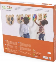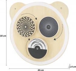 Drvena zidna ploča s motivom medvjeda idealna je za razvoj logičkog mišljenja i mašte djece. Sadrži tri kružna elementa koji rotacijom stvaraju optičke iluzije, a obojana je netoksičnim bojama u živim nijansama. Ova igračka oduševit će svako dijete i prikladna je i za dom i za obrazovne ustanove.
