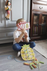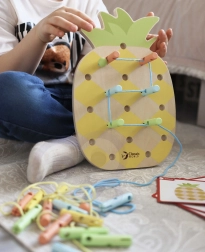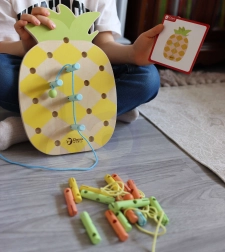 Ova igračka pomaže djeci razviti finu motoriku i koordinaciju ruka-oko prilikom navlačenja uzica kroz klipiće, poboljšava kreativnost i maštu.
