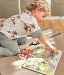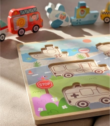 Ova drvena Montessori umetaljka donosi djeci zabavno učenje kroz igru. Set čini robusna ploča s izrezima i 7 dijelova vozila (npr. auto, taksi, policija, hitna pomoć, vatrogasci, zrakoplov, brod) koje djeca usklađuju prema obliku i slici. Zahvaljujući jasnim bojama i preglednim obrisima djeca brzo shvaćaju princip uparivanja te sa svakim pravilno umetnutim dijelom doživljavaju osjećaj uspjeha.