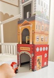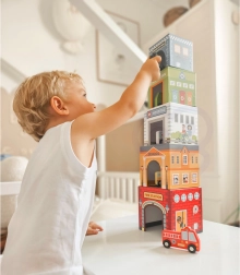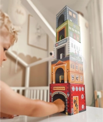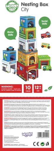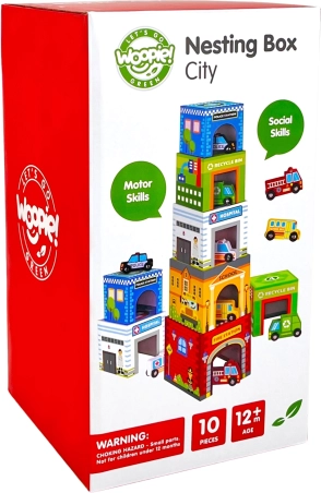 Umetalni grad WOOPIE GREEN je kreativna alternativa klasičnim konstrukcijskim setovima. Pet ilustriranih kartonskih kocaka predstavlja poznate gradske zgrade (npr. vatrogasce, školu, bolnicu, policiju) i numerirano je od 1 do 5 za lako učenje računanja i veličina. Posebni otvori u kockama omogućuju umećanje i spremanje vozila, pa djeca mogu stvarati vlastite priče i scene iz gradskog života.