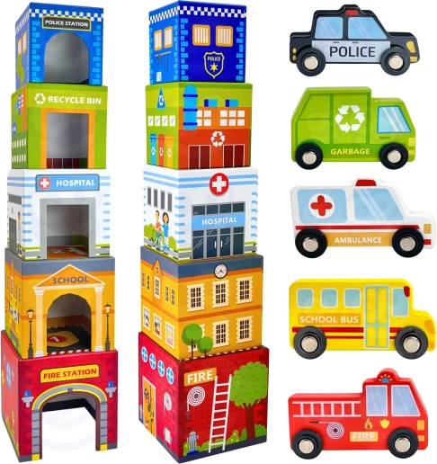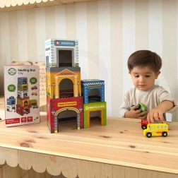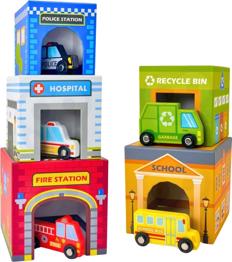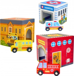Dio seta je pet simpatičnih drvenih autića na tihim gumenim kotačima (npr. vatrogasno vozilo, ambulanta, policijski auto, autobus, kamion za smeće). Igra potiče kreativnost i maštu, vizualnu percepciju i koordinaciju oko–ruka. Materijali i boje su sigurni i netoksični, idealni za male istraživače od 12 mjeseci.