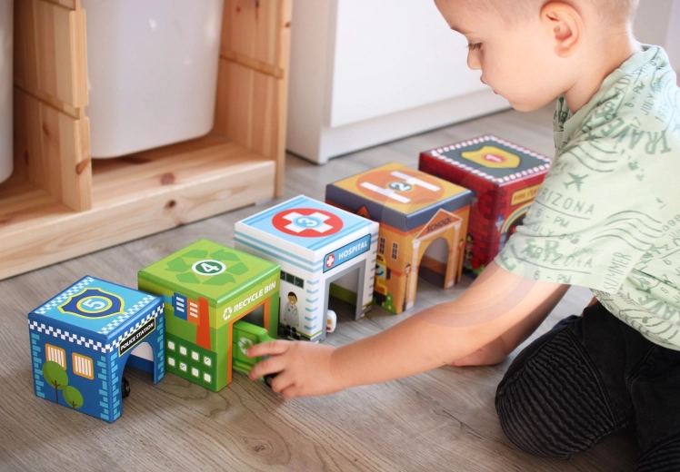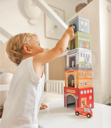 Pet numeriranih kocaka s otvorima omogućuje gradnju tornjeva, umećanje vozila unutra i razigrano otkrivanje grada – idealno za razvoj mašte.