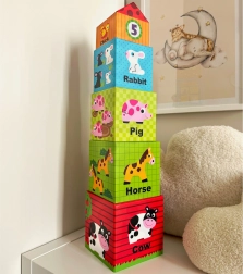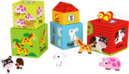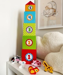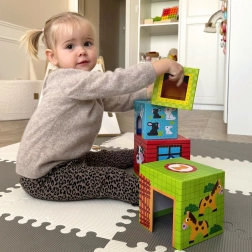 Ponumerirane kocke s jasnim ilustracijama uče dijete razlikovati veličine, brojati te ga upoznaju s engleskim nazivima životinja – prirodno, kroz igru.