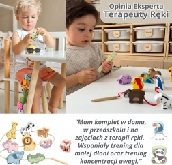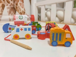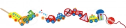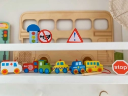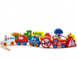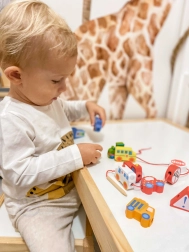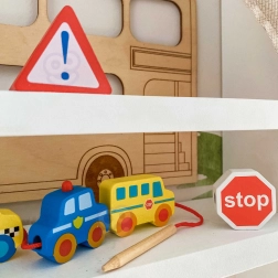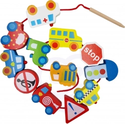 Ovaj kreativni set donosi djeci od 2 godine radost nizanja i slaganja. Zahvaljujući živim bojama i različitim oblicima vozila, male ruke uče preciznost i strpljenje, dok djeca kroz igru usvajaju osnove prometnog odgoja. Prirodno drvo i glatki rubovi osiguravaju ugodan i siguran dodir.