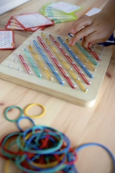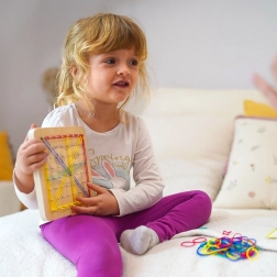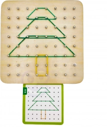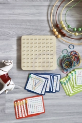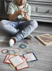 Napinjanje gumica između klinova jača prste, koordinaciju i uči planirati, uspoređivati i precizno raditi prema predlošku.