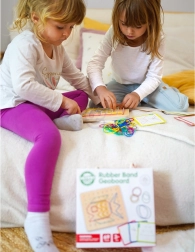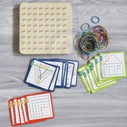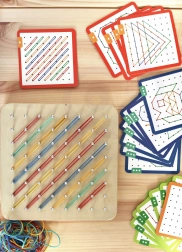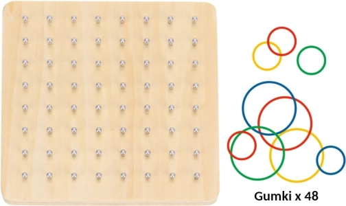 - Bogati set: drvena ploča s klinovima i 48 šarenih gumica za bezbroj kombinacija.
