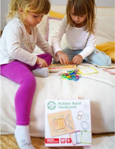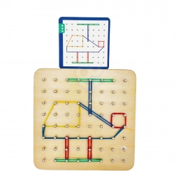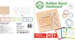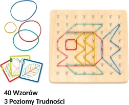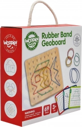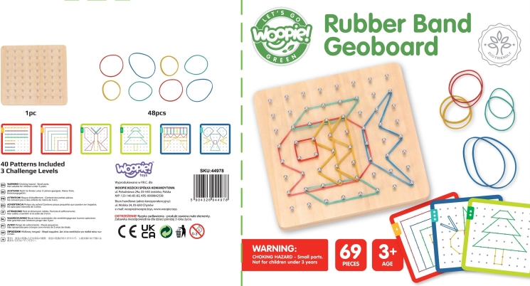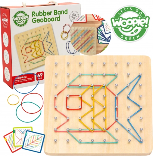 Drvena edukativna igračka geoplan brenda WOOPIE iz serije GREEN donosi djeci od 3 godine beskrajne mogućnosti stvaranja. Šarene gumice napinju se između metalnih klinova na čvrstoj drvenoj ploči i tako nastaju jednostavni i složeniji oblici. Djeca mogu slijediti obostrane karte s uzorcima ili isprobati vlastite kompozicije – idealna kombinacija igre i učenja.