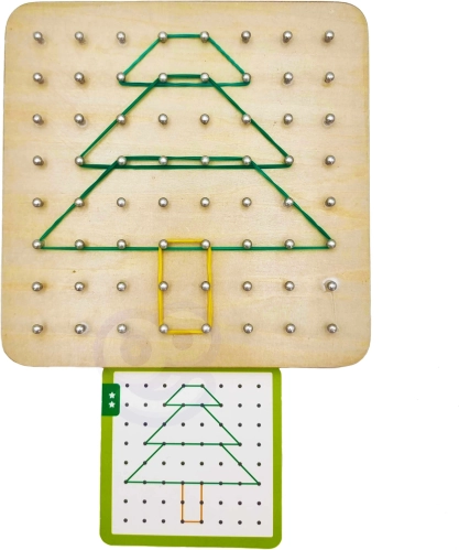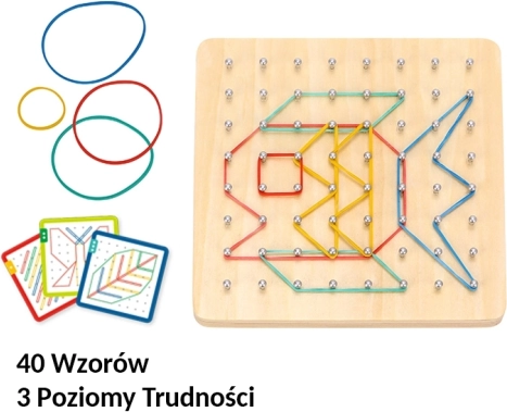 Otkrijte kreativnu edukativnu igru WOOPIE GREEN – drveni geoplan s gumicama koja spaja zabavu i učenje. Djeca na ploči s klinovima stvaraju oblike i uzorke prema kartama ili vlastitoj mašti, pritom razvijajući finu motoriku, logičko razmišljanje, koncentraciju i vizualno pamćenje. Prirodna izvedba od drveta, sigurni zaobljeni elementi i čak 3 razine težine osiguravaju duge sate smislenog igranja.