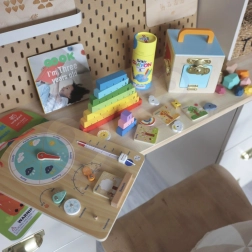 Ovaj bogati obrazovni box spaja omiljene montessori aktivnosti u jednu promišljenu cjelinu. Djeca vježbaju finu motoriku, strpljenje, balans i koncentraciju, ali i upoznavanje brojeva i vremena. U sklopu je i sažeti roditeljski vodič s savjetima kada i kako pojedine materijale uvoditi u igru.