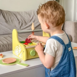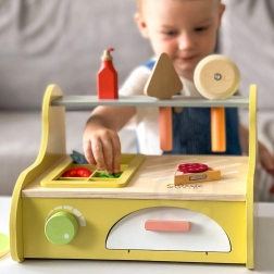Zahvaljujući bogatom priboru djeca treniraju finu motoriku, logiku pri slaganju i socijalne vještine tijekom zajedničkog kuhanja i posluživanja. Igračka je izrađena od certificiranog FSC drva i sigurnih materijala koji su nježni prema djeci i prirodi.
