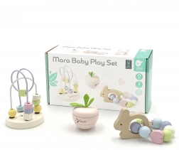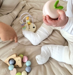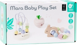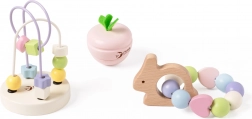 Pastelni set motivacijskih igračaka za bebe brenda Classic World osmišljen je kako bi donio radost i poticao osjetila vašeg djeteta već od prvih dana. Ovaj drveni set sadrži nekoliko prekrasnih predmeta koji pomažu u razvoju motorike i koncentracije. Sretni zečić je zvečkica s perlicama koja oduševljava svojim šarenim izgledom i melodičnim zvukovima. Tresenje ovom igračkom potiče dječju znatiželju i razvoj slušnih sposobnosti. Labirint s perlicama još je jedan dio seta u kojem djeca mogu okretati i pomicati perlice, čime razvijaju koncentraciju i motoričke vještine. Igračke iz ovog seta imaju nježnu teksturu i pastelne boje, što je ugodno i djeci i roditeljima.