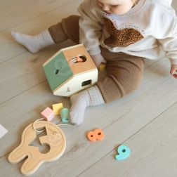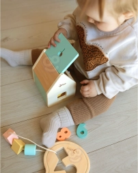 Drveni sorter s poklopcem i izrezima potiče djecu na prepoznavanje oblika i boja te jača koordinaciju oko–ruka i prostornu predodžbu.