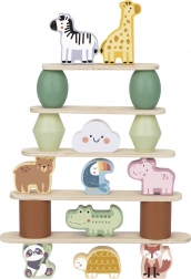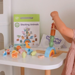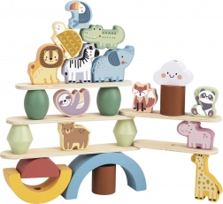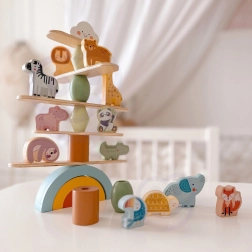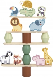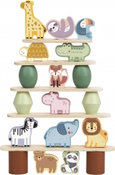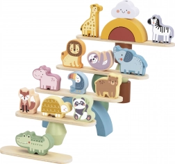 Drvene životinje za slaganje su idealna igračka za razvoj dječje kreativnosti. Set sadrži 12 simpatičnih drvenih životinja i 16 balansirajućih elemenata, kao što su drvena duga, kamenje, platforme i veseli oblak.