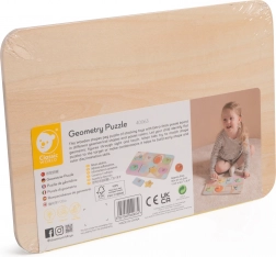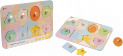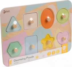 Ova prekrasna drvena slagalica nudi mnogo mogućnosti za učenje i zabavu. Set sadrži devet dijelova s različitim geometrijskim oblicima, obojenim u ugodne pastelne boje. Djeca uče prepoznavati oblike i boje tako da povezuju pojedine dijelove s odgovarajućim otvorima na ploči.