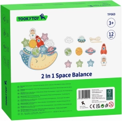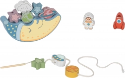 Prvi dio seta je balansirajući izazov: djeca nastoje postaviti 10 šarenih blokova – raketu, astronauta, zvijezde, NLO, planete i veseli oblak – na uspavano lice mjeseca, pazeći da se konstrukcija ne sruši. To je izvrsna prilika za vježbanje preciznosti i strpljenja.