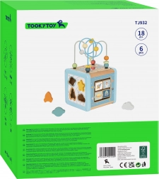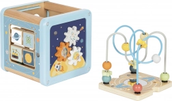 Drvena aktivna kocka s motivom svemira marke Tooky Toy donosi djeci od 18 mjeseci sate zabave i učenja. Nudi labirint s perlicama, razvrstavanje oblika, okretne slikovne kocke, šarene zupčanike i klizne elemente koji razvijaju finu motoriku, koordinacijske sposobnosti i logičko razmišljanje. Zahvaljujući pastelnim bojama i pametnom dizajnu, kocka je i lijepa i lako se sprema – gornji dio s labirintom može se sklopiti unutra.