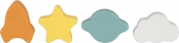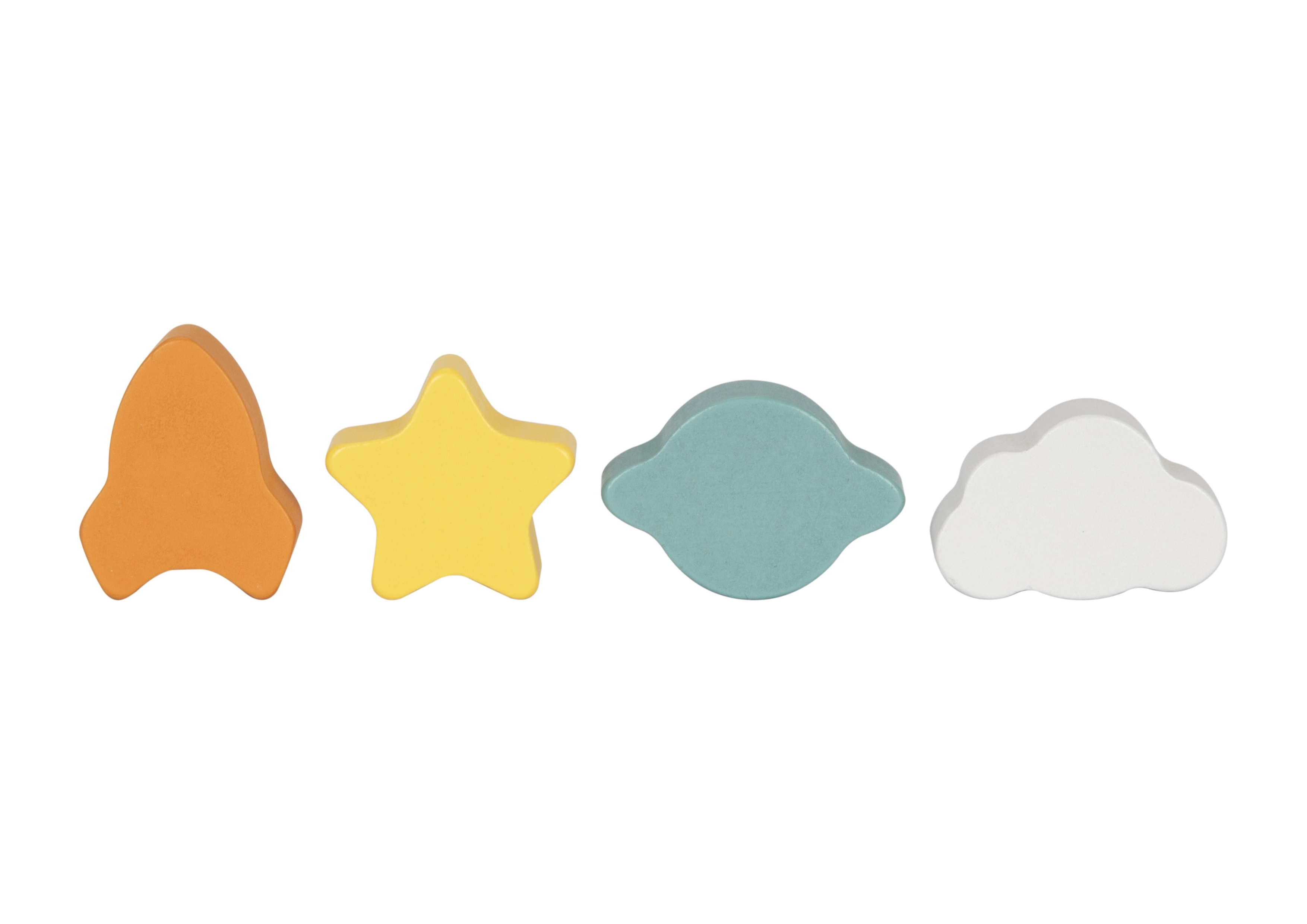 Otvorima u obliku planeta, zvijezde, rakete i oblačića djeca uče prepoznavati oblike i boje. Umetanje dijelova jača logičko razmišljanje i hvat.