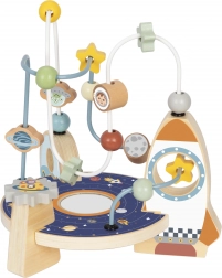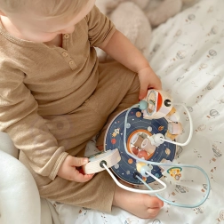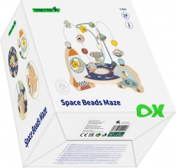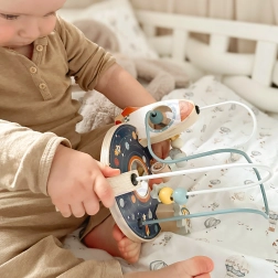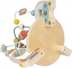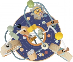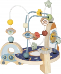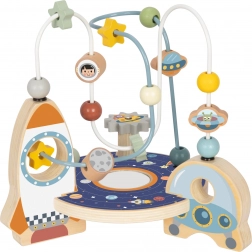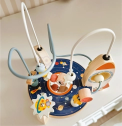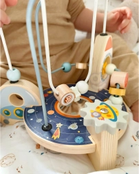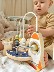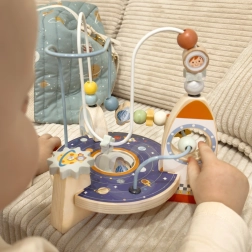Svemirski motorički labirint s raketom oduševit će svakog malog istraživača. Djeca mogu pomicati perlice u obliku planeta i zvijezda po vijugavim stazama, čime prirodno vježbaju preciznost pokreta, strpljenje i koncentraciju. Robusna drvena baza osigurava stabilnost tijekom igre, a glatki rubovi ugodni su na dodir.