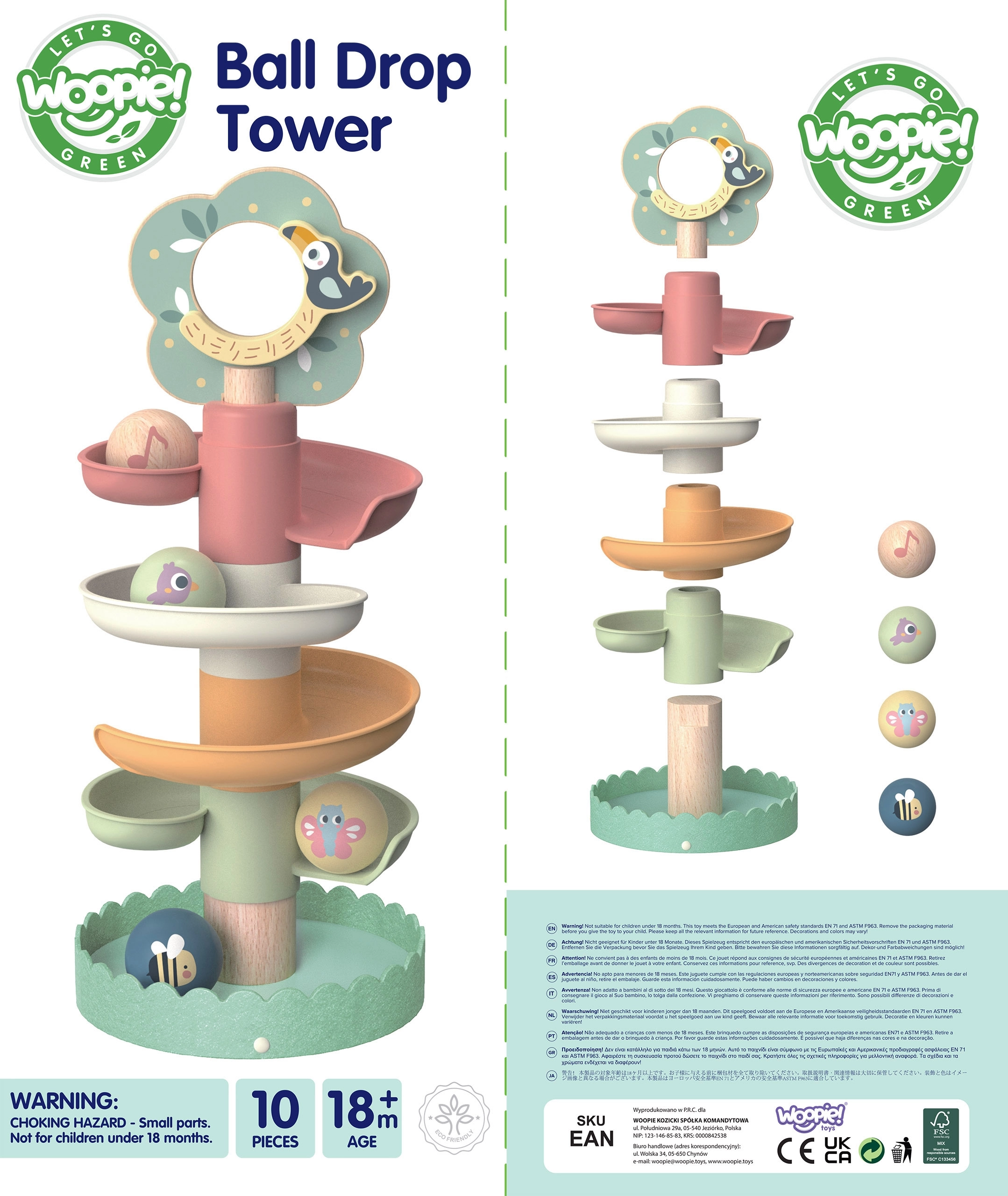 Otkrijte radost učenja kroz igru s drvenom stazom za kuglice WOOPIE GREEN. Spiralni toranj od 6 šarenih dijelova i 4 lagane kuglice sa životinjama potiču koordinacijske vještine, finu motoriku i osjetilnu percepciju. Jednostavno slaganje, sigurni materijali i ugodni šumski motivi pozivaju na samostalnu, kreativnu igru djece od 18 mjeseci.