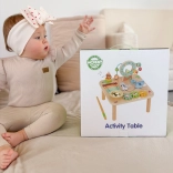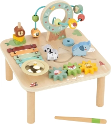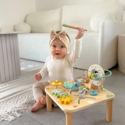 Otkrijte kvalitetni drveni activity stolić koji djecu prirodno vodi k otkrivanju. Zahvaljujući raznolikim zonama za igru – od glazbenog ksilofona preko zupčanika pa sve do labirinta s kuglicama – djeca vježbaju koordinaciju, preciznost pokreta i razumijevanje uzroka i posljedica. Čvrsta drvena konstrukcija i nježne pastelne boje savršeno se uklapaju u dječju sobu.
