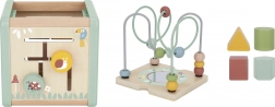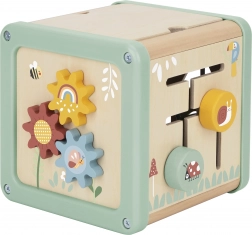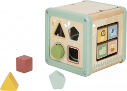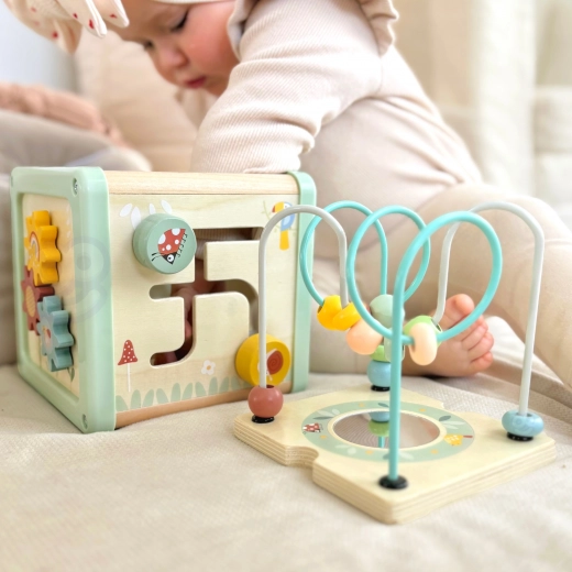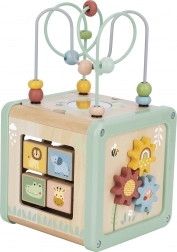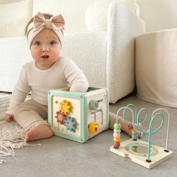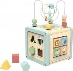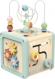 Ova multifunkcionalna drvena kocka podržava prirodan razvoj djeteta kroz smisleno igranje. Pastelne boje privlače pažnju, dok raznolike aktivnosti treniraju finu motoriku, koordinaciju oko–ruka, logičko razmišljanje i prepoznavanje oblika i boja.