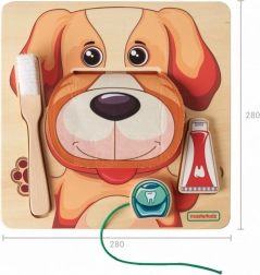 Upoznajte djecu sa zdravim navikama na zabavan način. Ploča s motivom psića ima otvarajuća usta i 10 realistično prikazanih zubi koje mali zubari mogu čistiti priloženim pomagalima. Kroz igru uloga djeca prirodno usvajaju ispravne tehnike čišćenja zubi i lakše pamte dnevnu rutinu. U duhu Montessori pristupa, pomagalo potiče samostalnost, koncentraciju i prirodno učenje kroz igru.