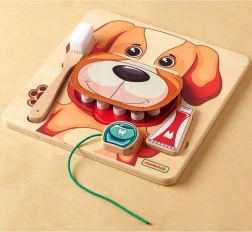 U kompletu su drvena četkica, pasta i zubni konac, pa djeca sigurno isprobavaju cijeli postupak – od nanošenja paste, preko kružnih pokreta četkicom, do nježnog „koncanja“. Igra istodobno razvija finu motoriku, koordinaciju oko–ruka i strpljenje. Kvalitetno drveno izvedenje s premazom na bazi vode izdržljivo je i ugodno na dodir; kompaktna dimenzija 28 × 28 cm odgovara dječjoj sobi i vrtiću.