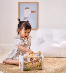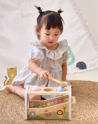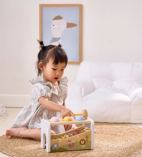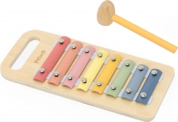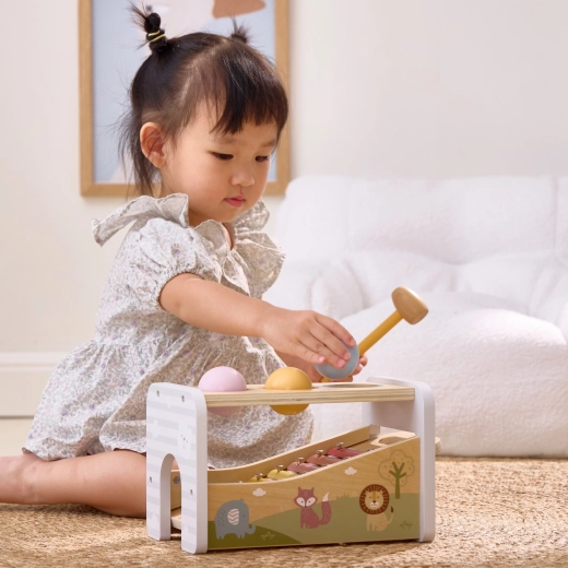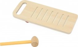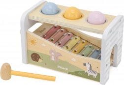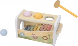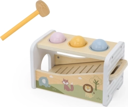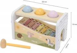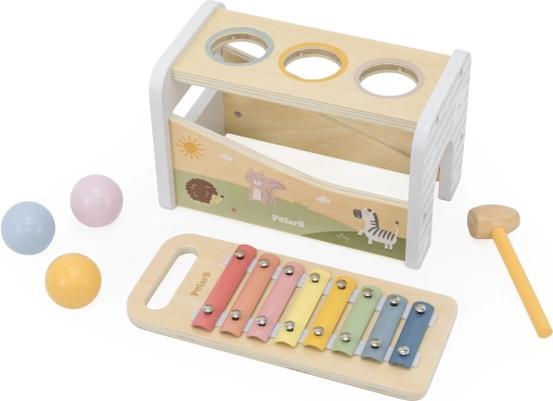 Ova svestrana drvena igračka spaja udarnu klupu i ksilofon u jednu pametnu cjelinu. Dijete može čekićem protiskivati šarene loptice koje se otkotrljaju na metalne tipke i proizvedu ugodne tonove ili uzeti palicu i stvarati vlastite melodije.