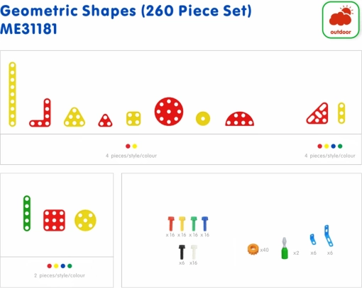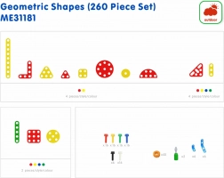 Ovaj sveobuhvatni set sadrži kvadrate, trokute, krugove, polukrugove i plosnate trake u nekoliko boja, koje se zahvaljujući otvorima lako pričvršćuju pomoću vijaka na panele, stolove ili kolica Masterkidz. Djeca mogu stvarati uzorke, cvjetove i složenije konstrukcije te pritom vježbati planiranje, odabir elemenata i doradu detalja.
