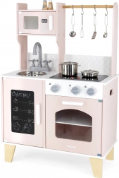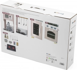 Dio kompleta je bogat pribor: lonac s poklopcem, tava, žlica, rupičasta lopatica, špatula, set “povrća” te soljenka i paprenka. Funkcionalni detalji poput 3 okretna gumba, otvarajućih vrata pećnice i ormarića te vješalica za pribor dodaju igri dozu realizma i razvijaju finu motoriku, kreativnost i socijalne vještine.