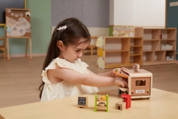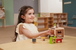 Kvalitetno masivno drvo i sigurni završni premazi osiguravaju dug vijek trajanja i pri svakodnevnoj igri. Set potiče socijalnu interakciju, komunikaciju i razvoj mašte – djeca mogu „kuhati kavu”, prodavati peciva i stvarati vlastite kafićne priče.