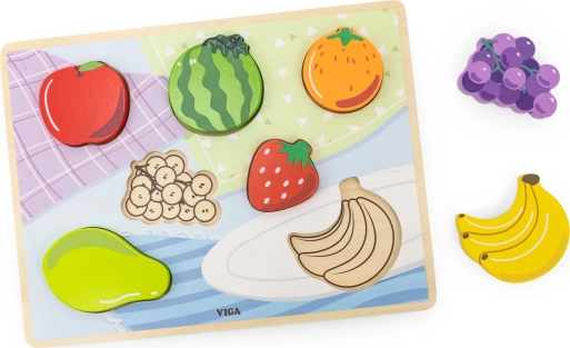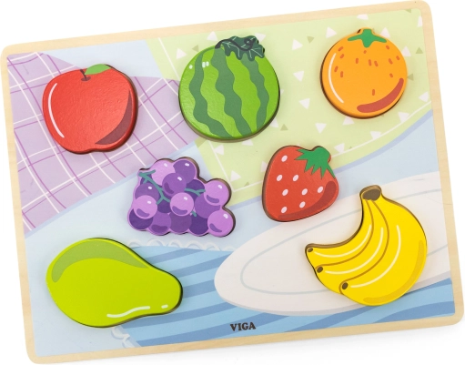 Šarene drvene puzzle brenda Viga s motivom voća razvijaju finu motoriku, koordinaciju oko–ruka i logičko razmišljanje. Djeca tijekom igre pridružuju oblike pojedinih plodova odgovarajućim otvorima na podlozi s pomoćnim obrisima. Zahvaljujući debljim dijelovima voće se može koristiti i kao samostalne figurice za dodatne igre.